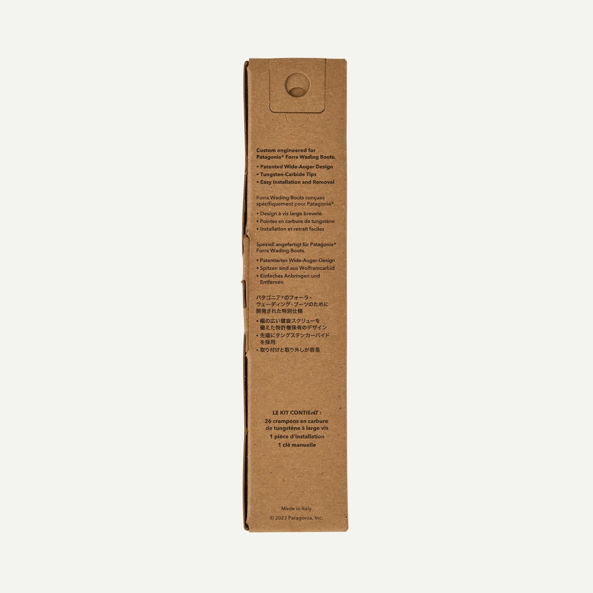 Kit contains 26 wide-auger tungsten-carbide studs, 1 installation tool, 1 manual driver, and is specifically engineered for Patagonia® Forra Wading Boots built by Fitwell