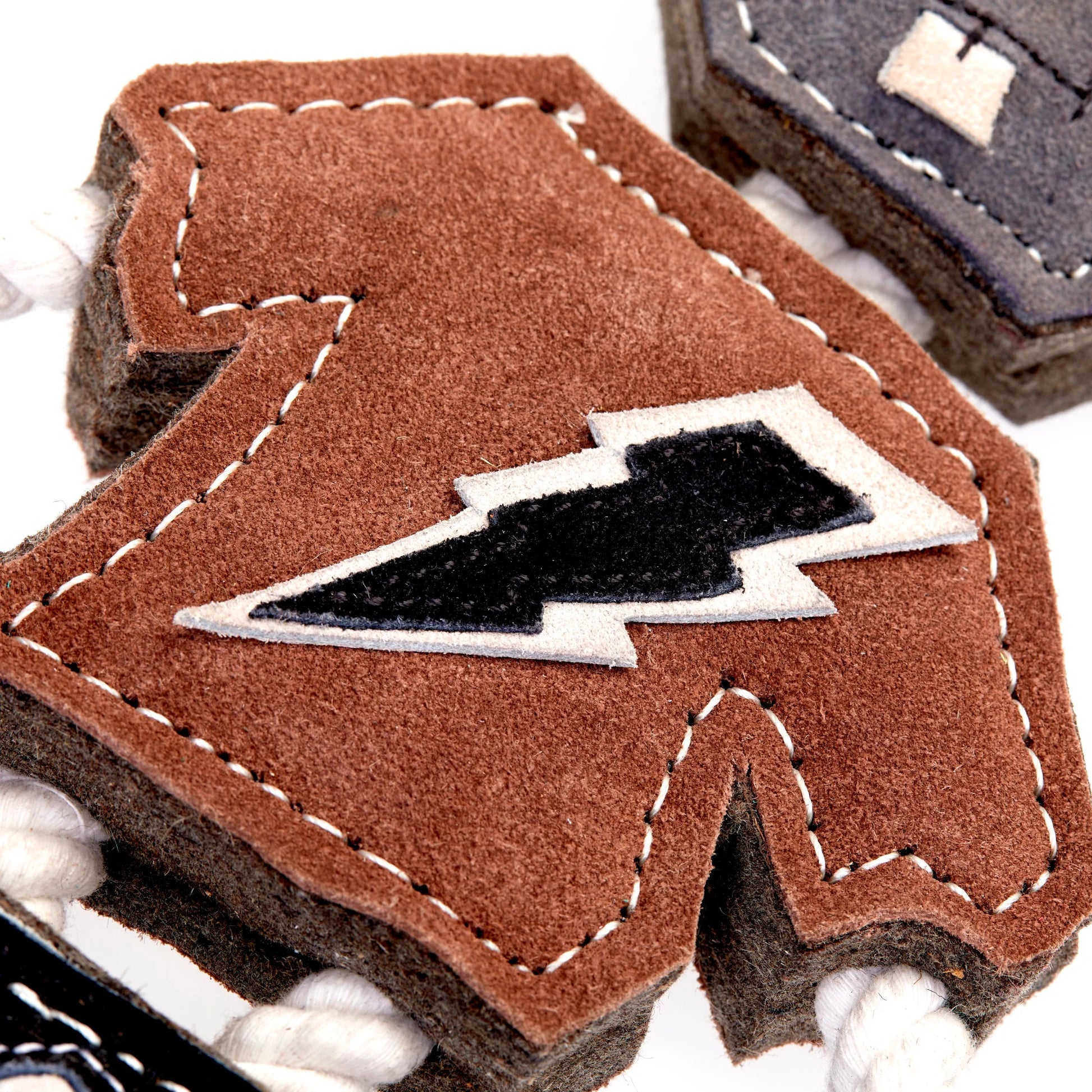This larger sized toy, combines natural jute stitched over with soft suede, and lots of jute rope to chew or tug on. Jute is 100% recyclable and sustainable. The suede is a by-product, ensuring that this material is not wasted. It is tough and long lasting and is produced without using any added compound that would harm or be released when chewing. This ensures hours of safe fun for you and your dog.