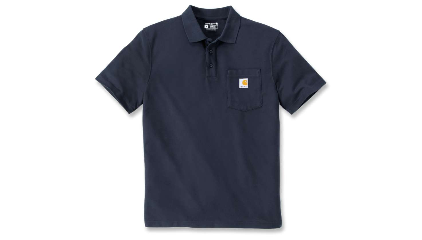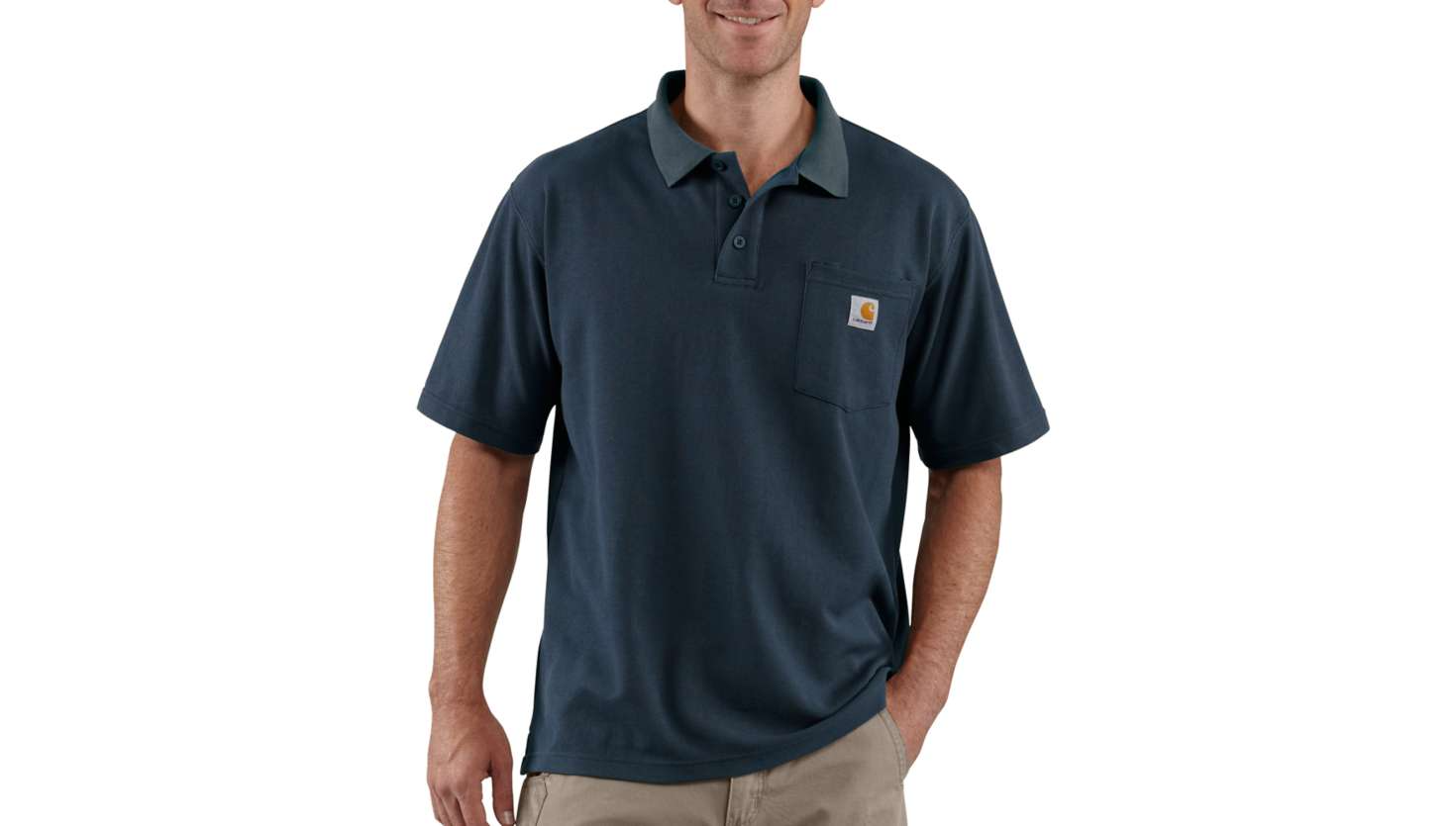 Loose Fit · No-roll rib knit collar · Short Sleeve · Left-chest Contractor's Work Pocket with unique silo for pens, pencils or tools · Three-button front · No cuffs for increased range of motion · Square bottom with side vents · Small split in side seams · Colour-fast fabric · Carhartt label sewn on pocket · 6 oz/yd² - 204 gsm · Pique · 62% Polyester/38% Cotton