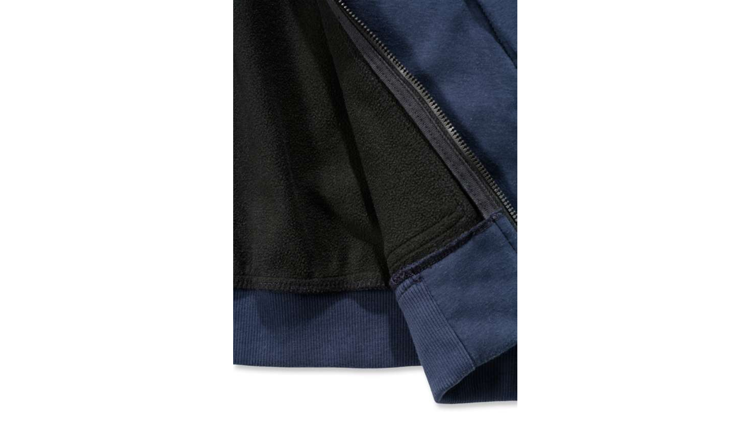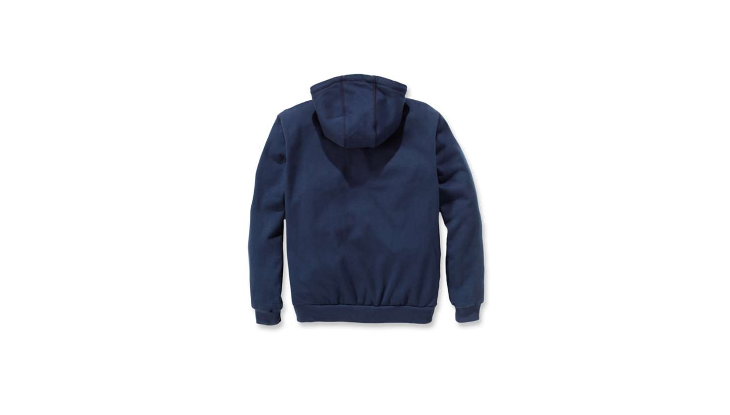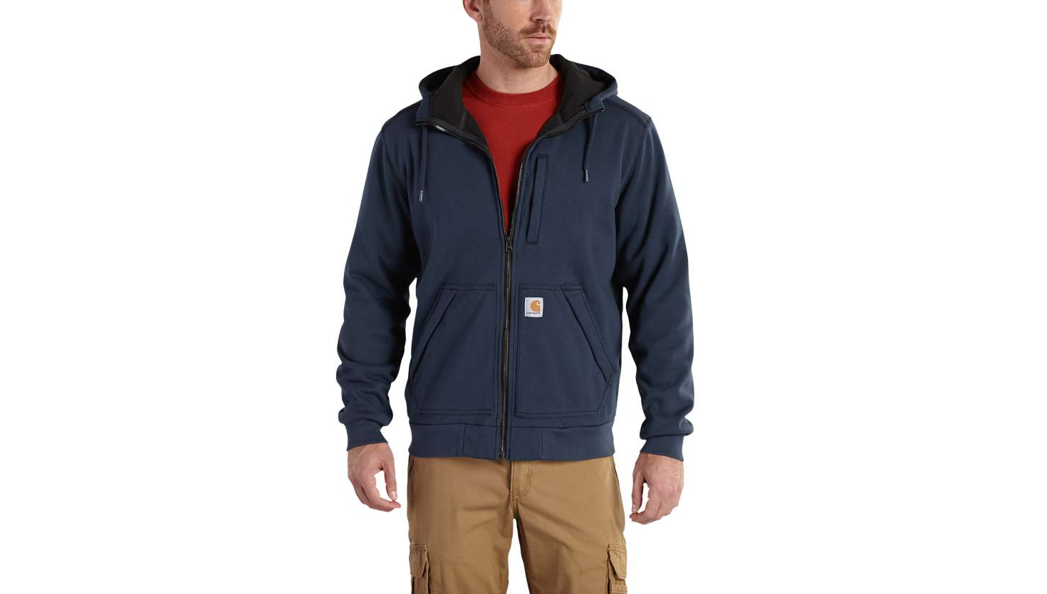 Relaxed Fit · Rain Defender™ - Durable Water repellent finish · Wind Fighter™ - Wind resistant · Attached three-piece hood with adjustable draw cord · Long Sleeve · Left chest map pocket with hidden zipper closure · Two lower front split hand warmer pockets with flap closures · Full-length front zipper · Stretchable, elastane reinforced rib knit cuffs and waistband · Triple stitched main seams · Carhartt label sewn on pocket · 9.1 oz/yd² - 309 gsm · Wind Resistant Fleece · Black, Carbon Heather, Peat - 65% Polyester/27% Cotton/8% Polyurethane · Navy - 65% Polyester/27% Cotton/8% PU
