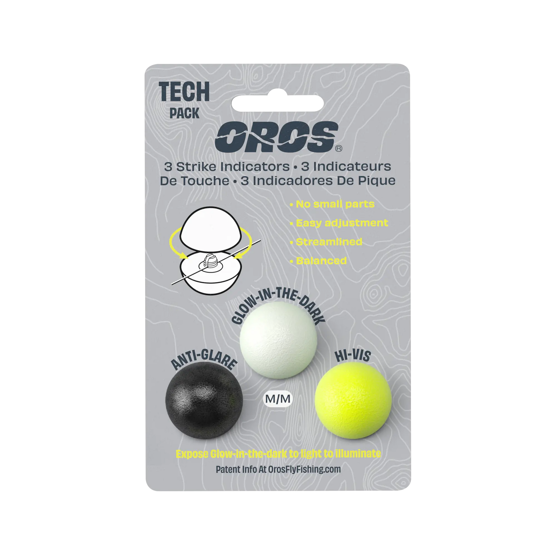 The Oros tech pack includes three strike indicator colors glow-in-the-dark, black/anti-glare and hi-visibility chartreuse.