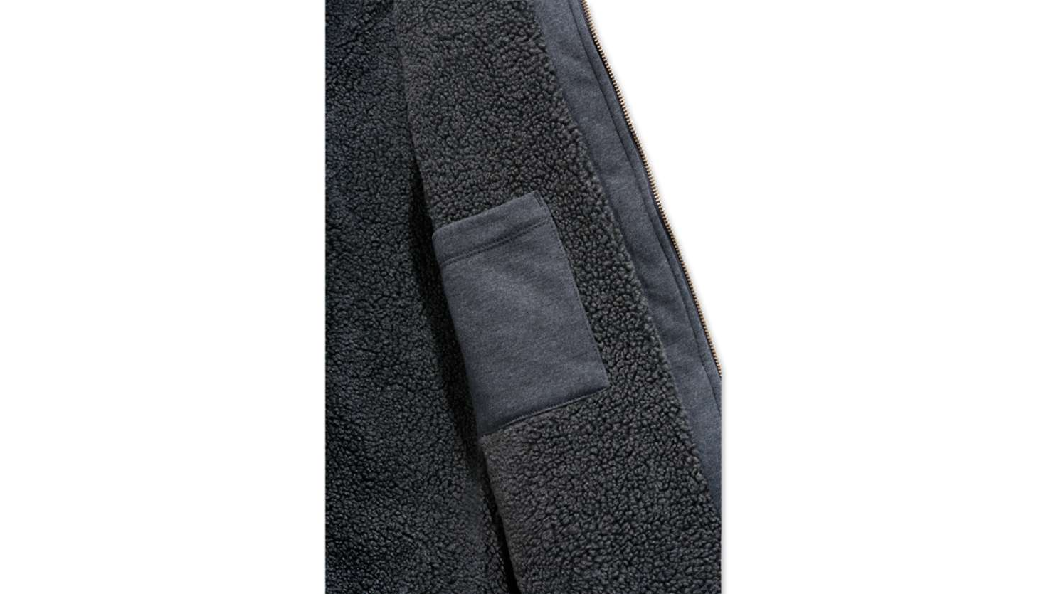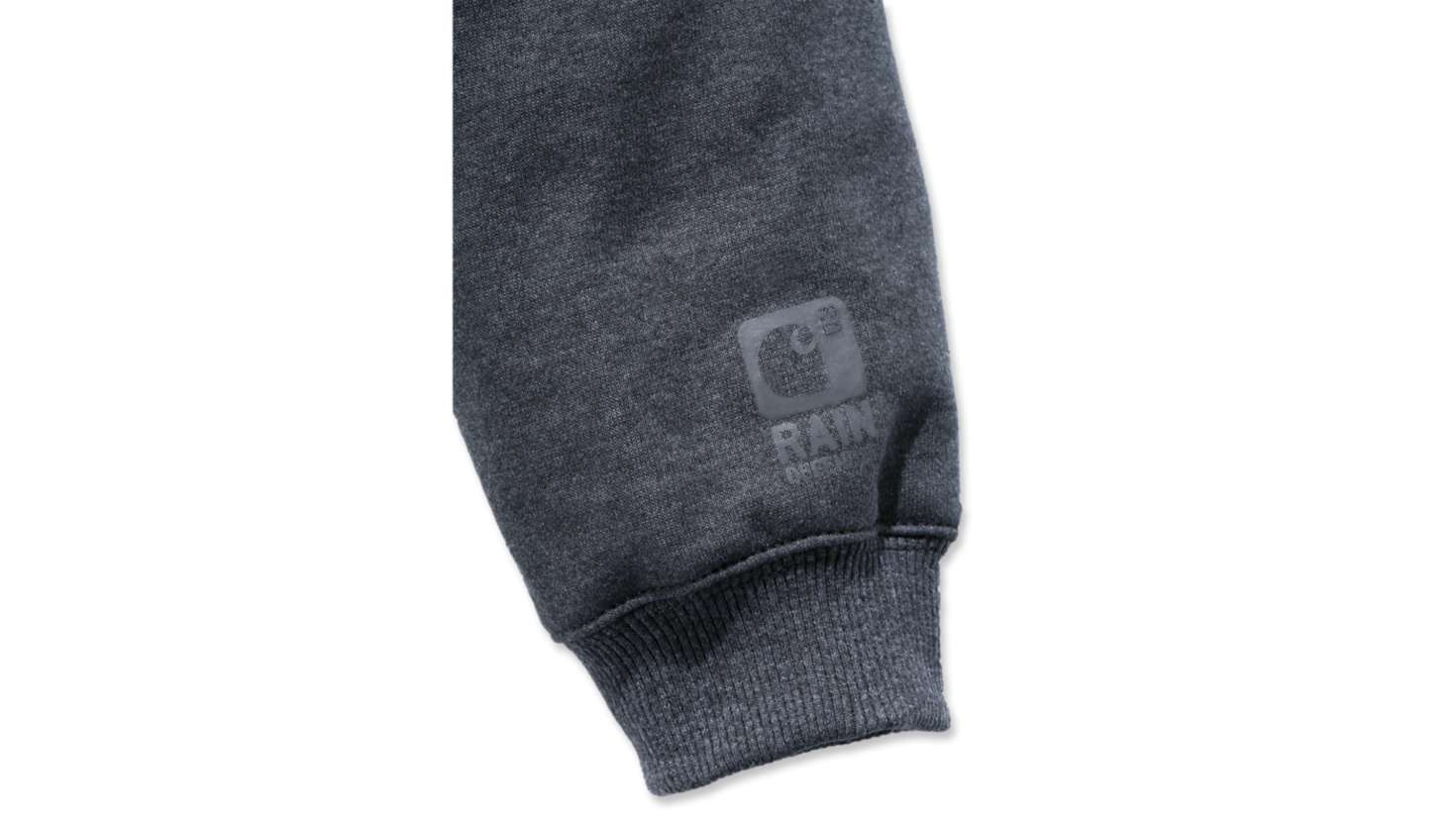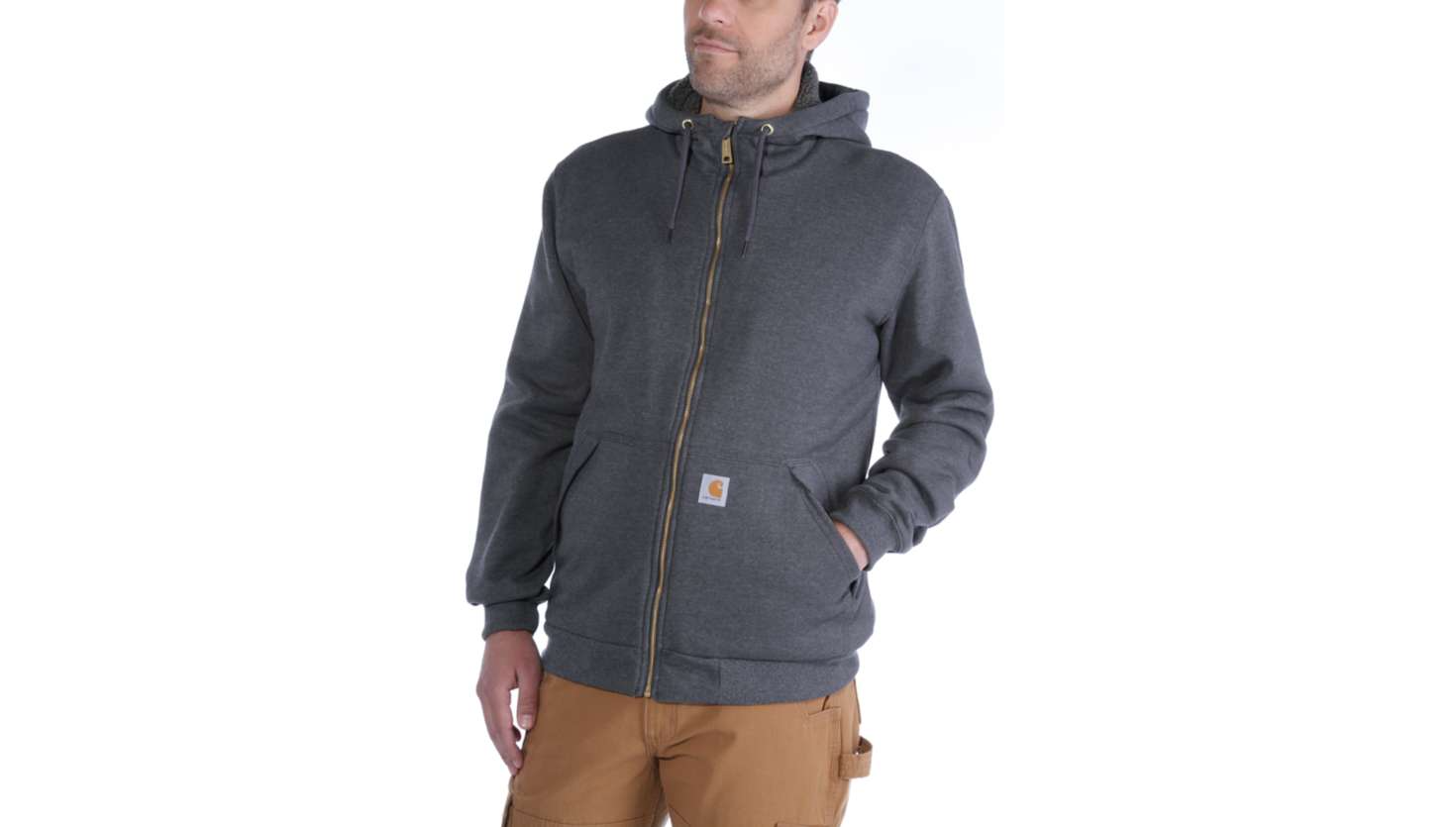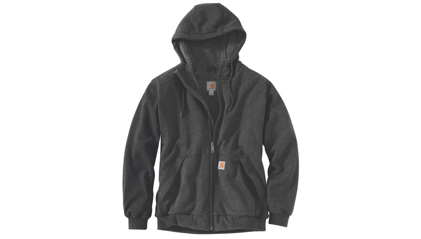 Relaxed Fit · Rain Defender™ - Durable Water repellent finish · Attached Sherpa lined three-piece hood with adjustable draw cord · Long Sleeve · Two front split hand warmer pockets with flaps for added security and a hidden media pocket · One left Interior pocket · Full-length front zipper with chin protector · Stretchable, elastane reinforced rib knit cuffs and waistband · Carhartt label sewn on pocket · DWR Fleece · Lightweight Sherpa · 59% Cotton/41% Polyester