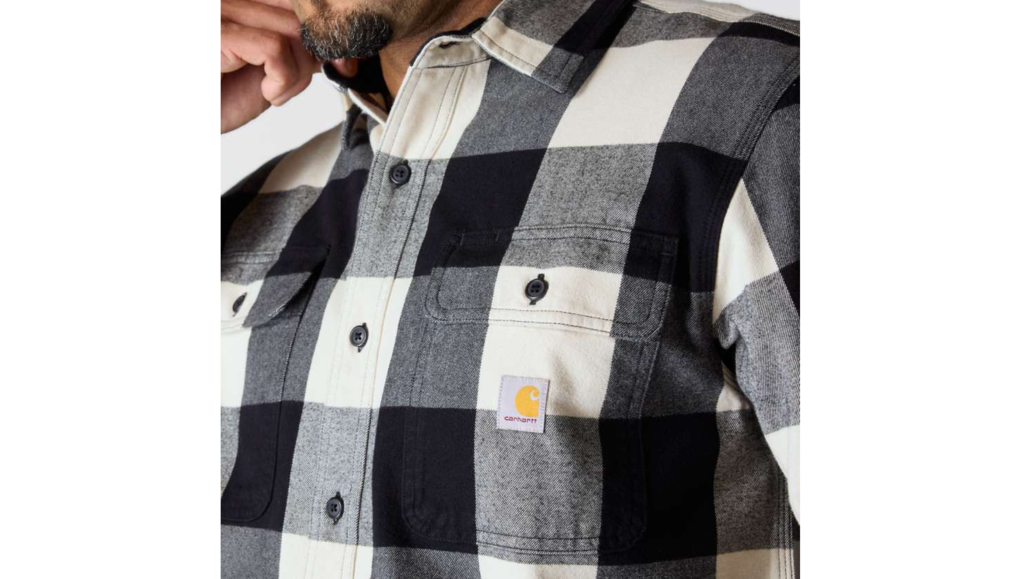 Loose Fit · Two-piece stand collar · Two pleats along back yoke seam for ease of movement · Long Sleeve · Two chest pockets with flaps and button closure and left chest pocket with pencil opening · Button front closure · Two-button adjustable cuffs with extended plackets · Triple stitched main seams · Garment washed for a soft finish and reduced shrinkage · Carhartt label sewn on pocket · 8 oz/yd² - 272 gsm · Solid & Grindle Flannel · 100% Cotton