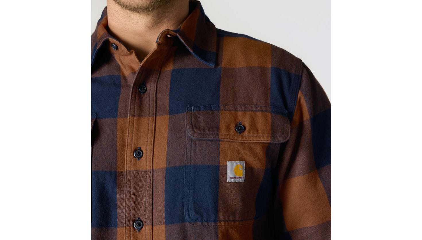 Loose Fit · Two-piece stand collar · Two pleats along back yoke seam for ease of movement · Long Sleeve · Two chest pockets with flaps and button closure and left chest pocket with pencil opening · Button front closure · Two-button adjustable cuffs with extended plackets · Triple stitched main seams · Garment washed for a soft finish and reduced shrinkage · Carhartt label sewn on pocket · 8 oz/yd² - 272 gsm · Solid & Grindle Flannel · 100% Cotton