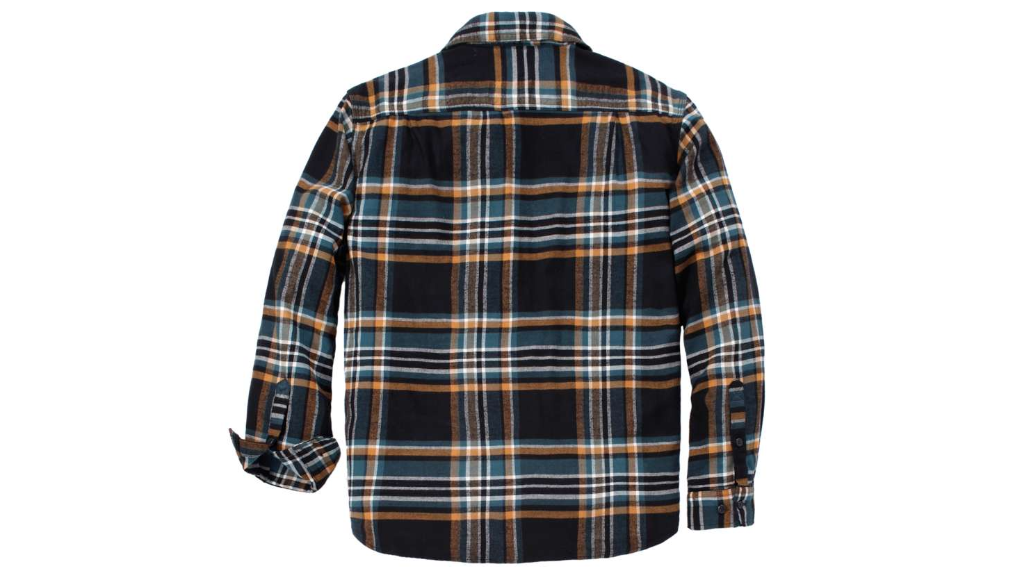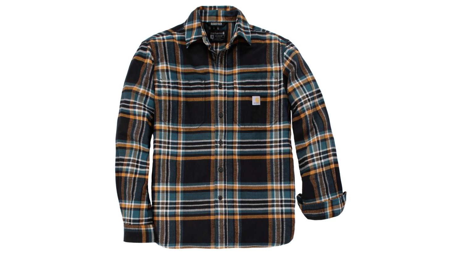 Relaxed Fit · Rugged Flex™ - Allows for more movement · Two-piece stand collar · Long Sleeve · Two chest pockets: left chest pocket with pencil opening and additional panel for added storage · Button front closure · Two-button adjustable cuffs with extended plackets · Aligned shirt tails front and back · Triple stitched main seams · Garment washed for a soft finish and reduced shrinkage · Carhartt label sewn on pocket · 5.6 oz/yd² - 190 gsm · Stretch Flannel · Black, Red Duck, Carhartt Brown, Dark Sepia - 97% Cotton/3% Elastane · Faded Fatigue, Forestry Green/amber Terrain, Navy - 97% Nylon/3% Elastane