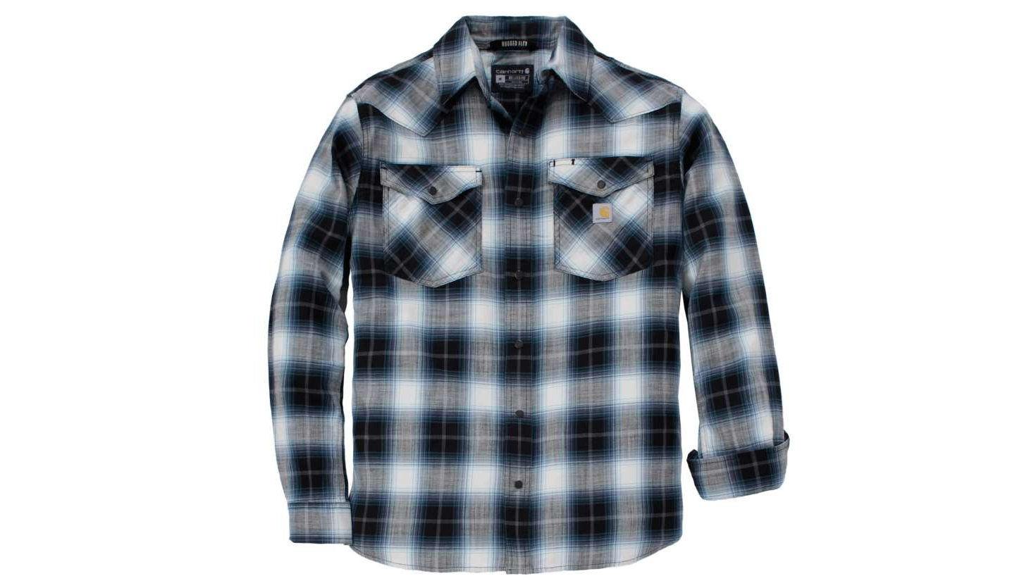Relaxed Fit · Rugged Flex™ - Allows for more movement · Two-piece stand collar · Long Sleeve · Two chest pockets, left chest pocket with pencil opening · Pearl Snap front closure · Snap adjustable cuffs · Shorter length can be worn tucket or untucked · Garment washed for a soft finish and reduced shrinkage · Carhartt label sewn on pocket · 4 oz/yd² - 136 gsm · Printed stretch twill · 98% Cotton/2% Elastane