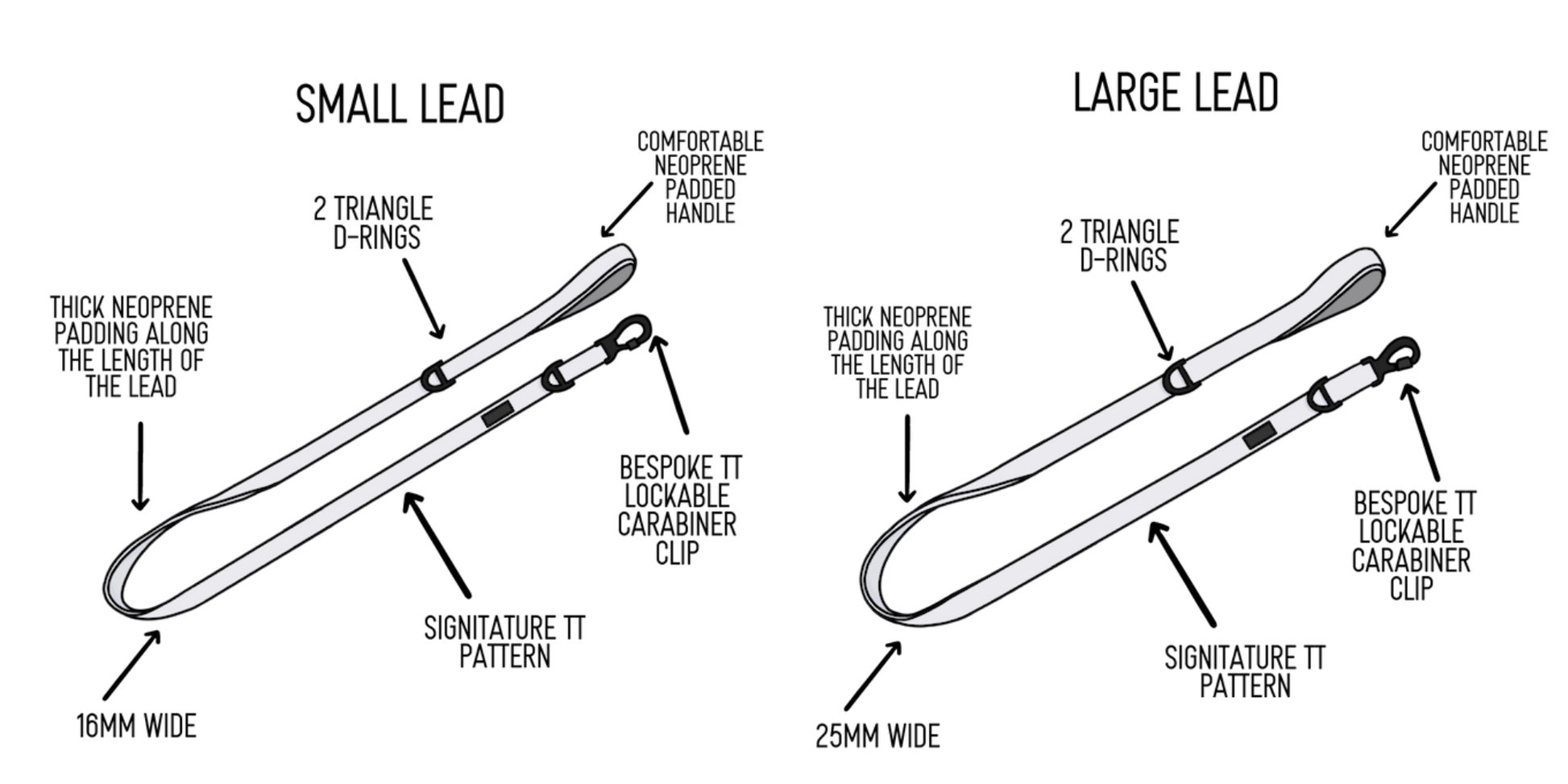 Made especially for medium-giant breeds, our large adventure lead has a larger, stronger locking carabiner to ensure a very high breaking strength of 160kg+. Made especially for small-medium breeds, our small adventure lead has a smaller locking carabiner to avoid any heaviness/bulky appearance but still has a breaking strength of 140kg+.