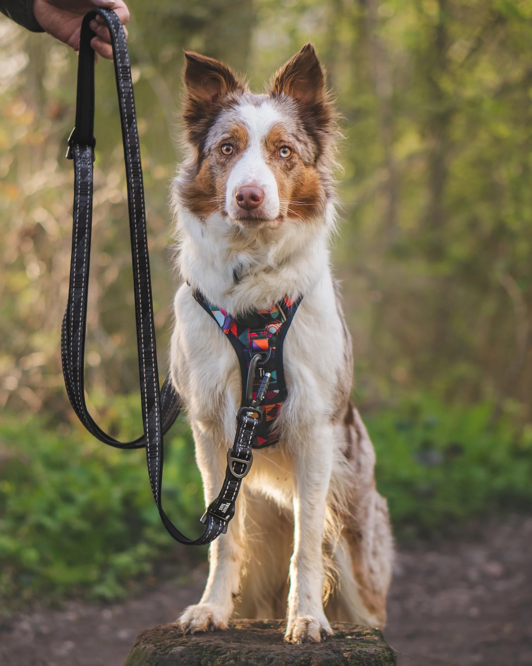 - Double-clipped onto the front and back of the harness for lead training and extra control for a lunging/reactive dog