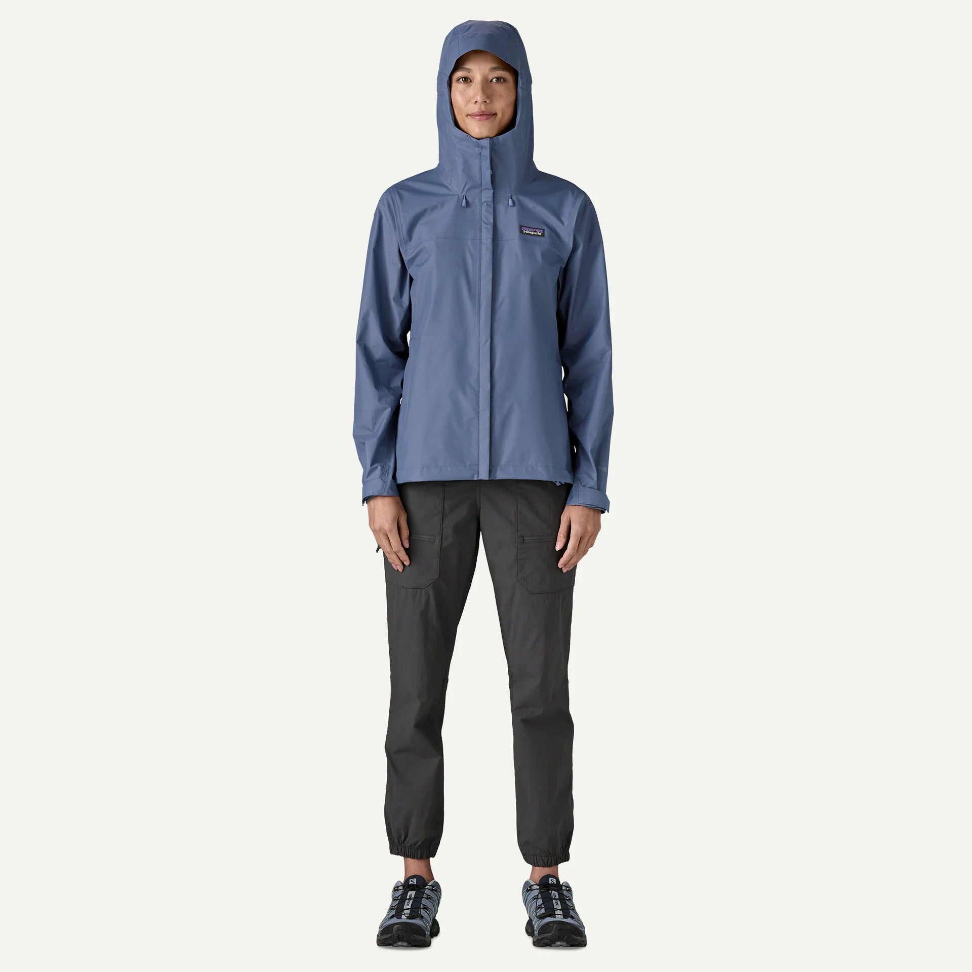 Self-fabric hook-and-loop cuff closures and an adjustable drawcord hem seal out precipitation