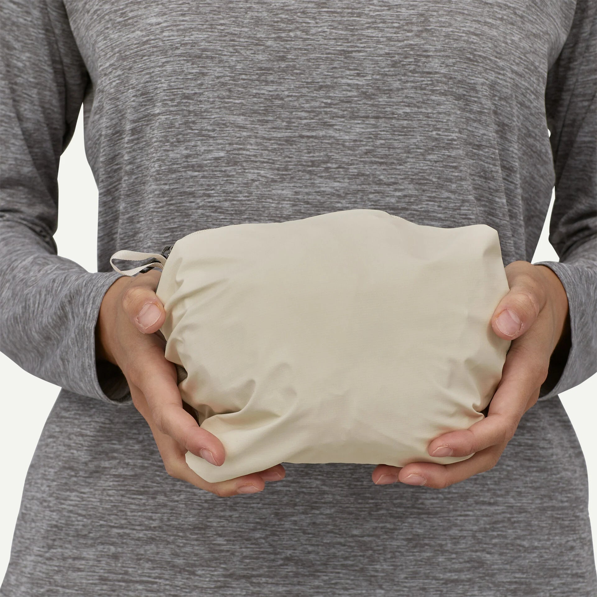 Two handwarmer welt pockets, and venting pit zips with welted exterior storm flaps; the jacket self-stuffs into the left handwarmer pocket with a carabiner clip-in loop